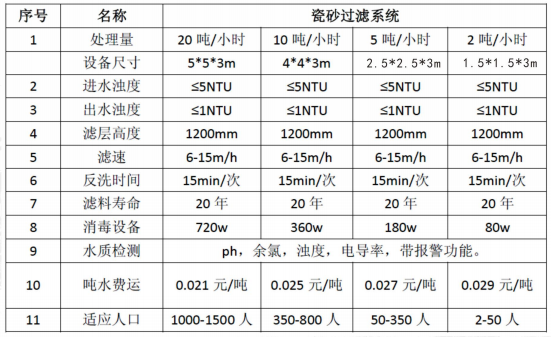 本系統采用原水經過自壓壓進入過濾器,原水與瓷砂濾料進行充分接觸攔截,不僅能夠截留 水中雜質,而且還能夠保證出水水質穩定,系統運行達到設定值時,自動啟動設備切換進行反沖 洗,無人值守自動控制系統自動如此往復運行,保證飲水指標,達到安全供水。